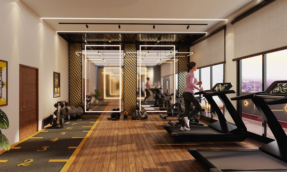 living. The podium level hosts a fully equipped gymnasium, a vibrant children’s play