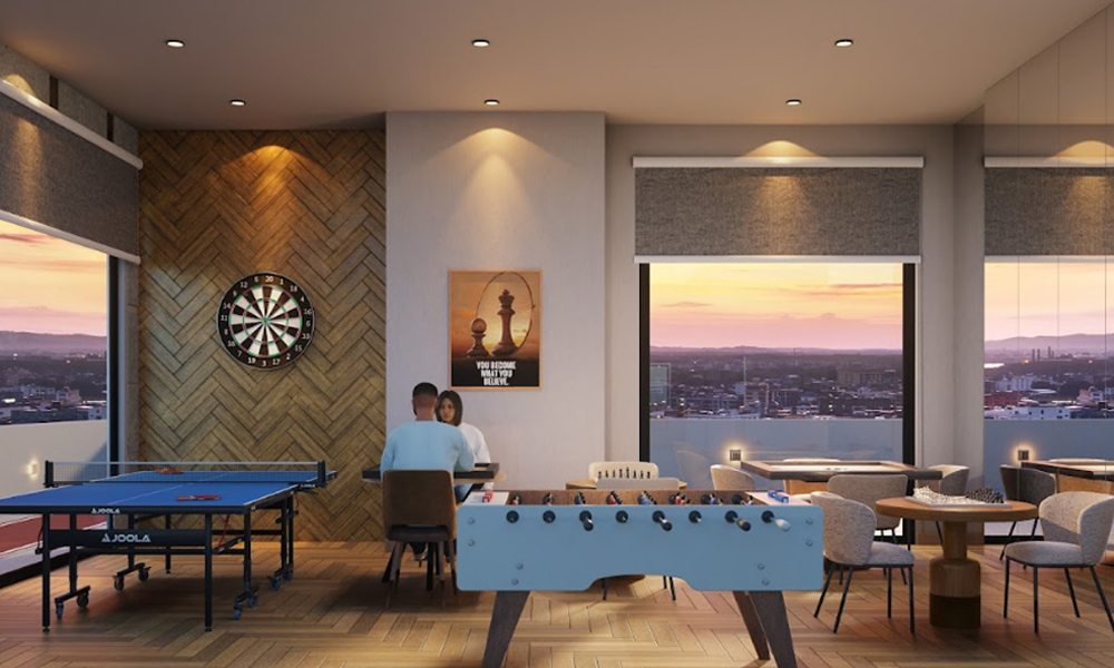 area, and a thoughtfully planned indoor games zone. Ascend to the terrace level, where